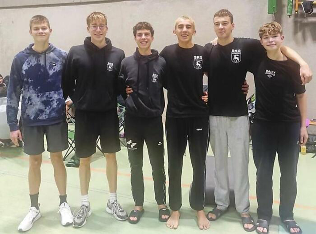 Feierten Podiumsplätze und Vereinsrekorde: Tom Blecken, Pascal Frank, Julius Wintermantel, Henrik Arta, Marco Bretfeld und Noah Erler (von links). © privat